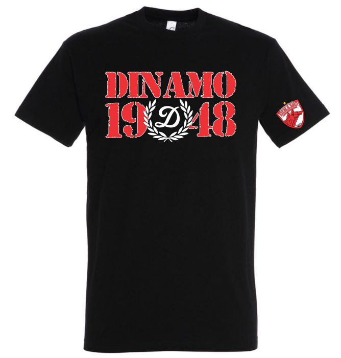 Tricou FC Dinamo București Dinamo 1948, culoare neagră, realizat din bumbac 100%. Design frontal cu text „DINAMO 1948” roșu, cu efect uzat, și emblemă centrală stilizată cu litera „D” încadrată de o cunună. Emblemă oficială FC Dinamo aplicată pe mânecă. Print DTG premium, durabil, destinat purtării zilnice de către suporteri.